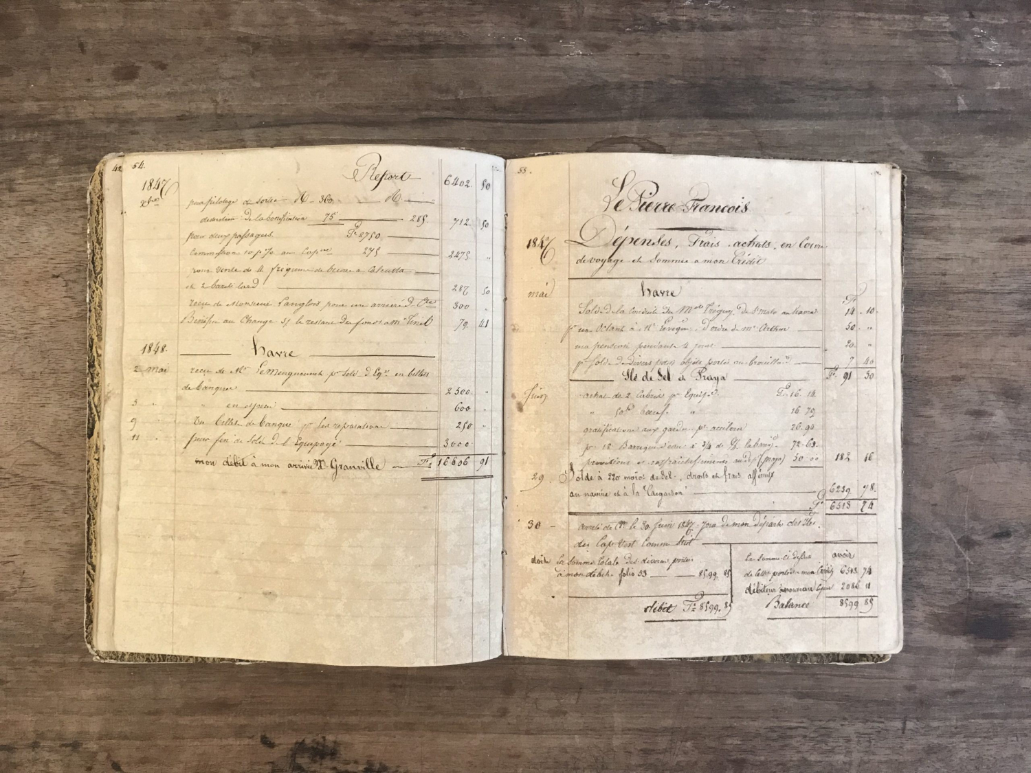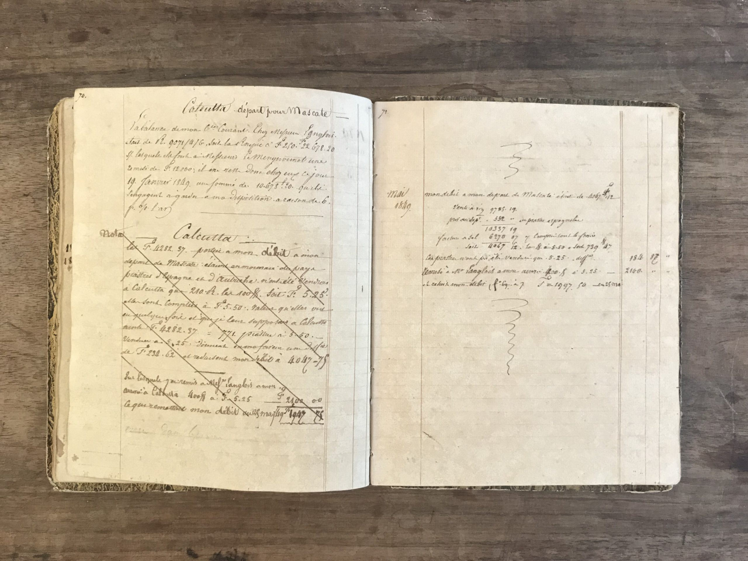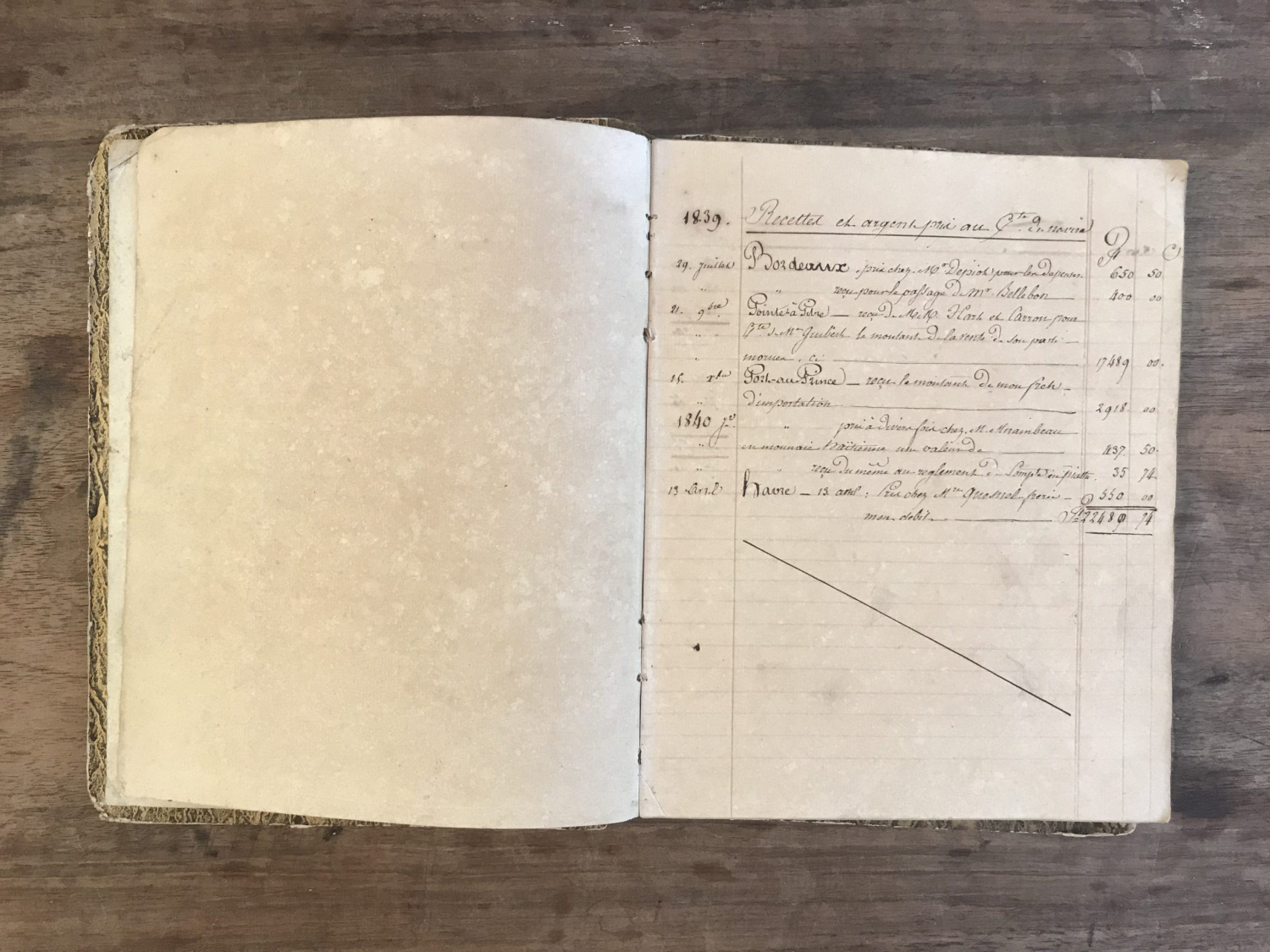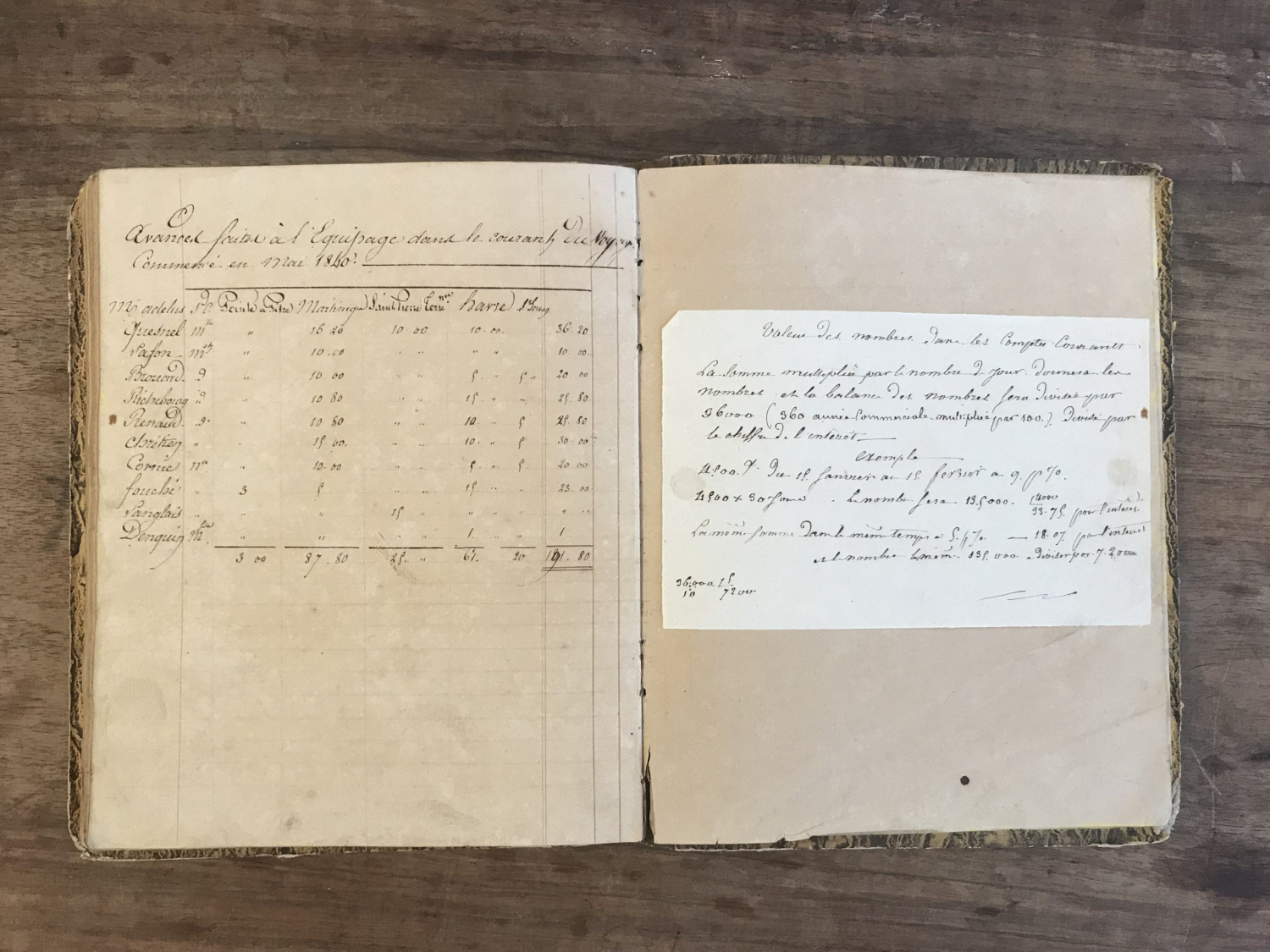Rare manuscrit relié de 136 pages manuscrites et 1 feuille annexe collé sur la dernière page portant la mention"Valeurs des nombres dans les Comptes courants", au format de 18 par 22,5cm sans titre et d'un auteur anonyme, que l'on a pu présumé être le Capitaine Louis Adolphe Brion suite à nos recherches, ce manuscrit compte une bonne dizaine de voyages ayant pour destination les Caraïbes puis les Indes au départ des ports de Bordeaux, St-Malo et du Havre principalement, de juillet 1839 à janvier 1854. Cet ouvrage comporte l'intérêt particulier de donner à lire une sorte de carnet de bord assez varié que cela soit par ses destinations ou ses cargaisons mais aussi de son capitaine-auteur qui navigue sur différents navires ou pour différents armateurs ; quelques petits défauts mais bel état général pour ce document qui a fait le tour du monde.