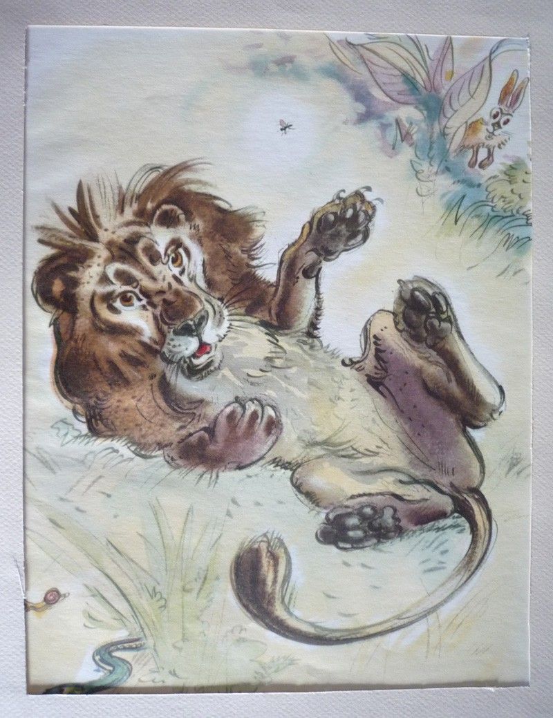 Illustration en couleurs (24,3 x 32 cm) par André Pec, "Le Lion et le moucheron" ; bords frottés, par ailleurs très bon état.