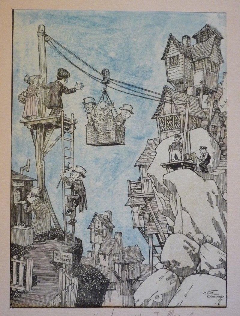 Illustration en noir (env. 18 x 22 cm) de C. E. B. Bernard, titrée "The Funnyville Trolley-Car" (funiculaire et habitations perchées sur pilotis) ; illustration partiellement coloriée au crayon de couleur, par ailleurs bon état.