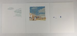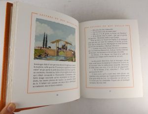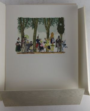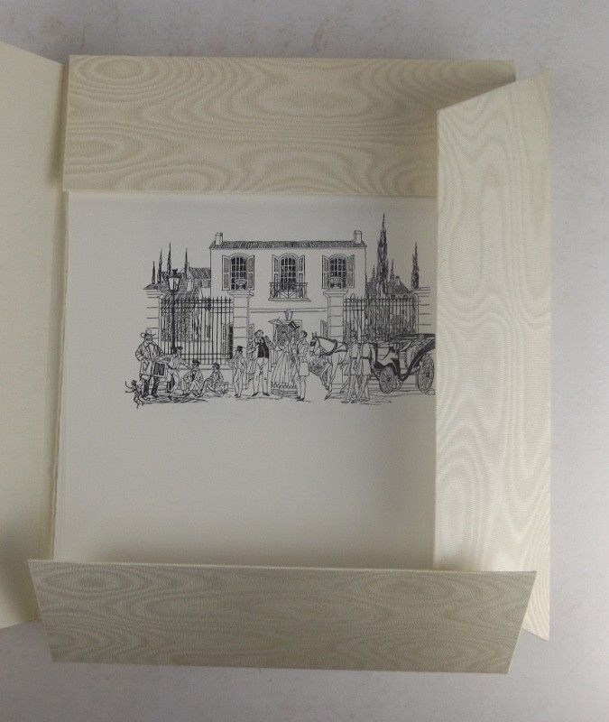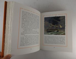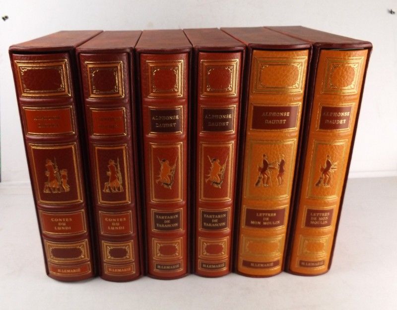 Six volumes in-4 (20 x 25 cm.), dont 3 volumes de texte et 3 volumes contenant les suites, reliés plein cuir pourpre/orange/rouge mosaïqué sous emboîtage bordé, quatre nerfs au dos avec caissons dorés et une illustration en cuir mosaïqué, pour les livres: tranche de tête dorée, gardes en soie moirée blanche, texte encadré, illustrations couleurs et vignettes monochromes in-texte, tranchefile, cahiers non-ébarbés, pour les suites: planches couleurs/monochromes et scènes décomposées selon couches couleurs sous chemise et coffret identique aux livres, 254 + 233 + 174 pages, un des 47 exemplaires sur Grand Vélin de Rives comportant une aquarelle originale et un dessin original d'un cul-de-lampe pour l'ensemble des trois ouvrages -une suite couleurs - une suite en noir - une décomposition couleurs (ici n°32), circa 1980, 1er papier sauf UN exemplaire réservé à l'éditeur ; menus incidents aux emboîtages, par ailleurs excellent état pour cette édition RARE.