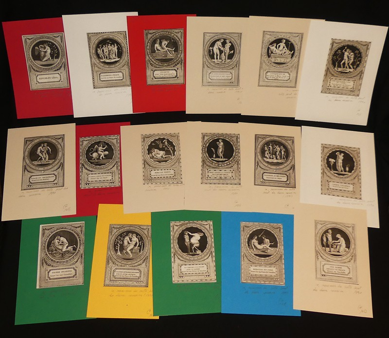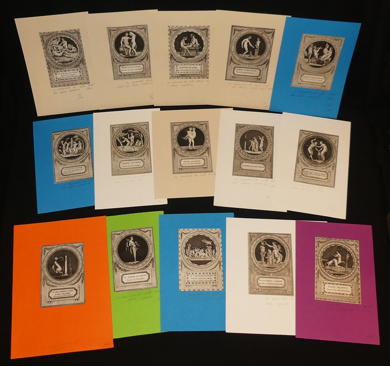 Lot de 32 gravures en noir et blanc, dimansion 8 x 11,5 cm, placées sous marie-louise, représentant des scènes érotiques tirées de l'ouvrage "Monumens du culte secret des dames romaines" (1790, Sabellus) ; petites traces sur deux des gravures ("Hercule et Hebé" et "Vulcain qui enveloppe Mars et Venus"), par ailleurs très bel état.