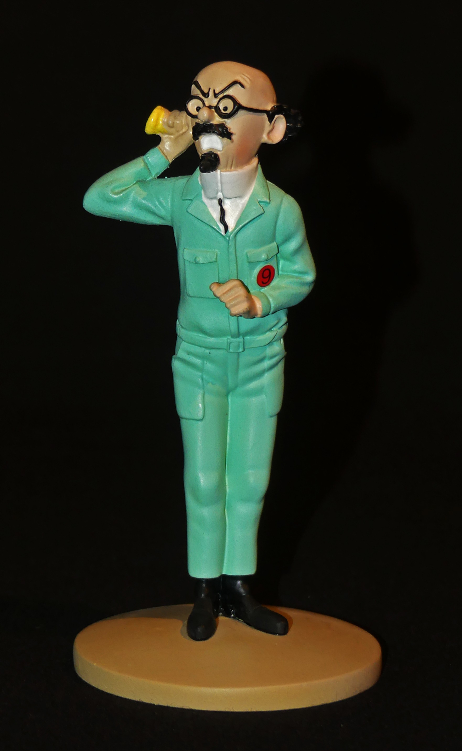 Le Professeur Tournesol au cornet' de l'album Objectif Lune. Figurine en résine polychrome (hauteur 12,5 cm, largeur 5 cm, diamètre du socle 6 cm), bien complète du passeport numéroté et du...