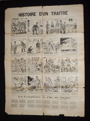 Affiche (45,5 x 63 cm), bande dessinée en noir et blanc de Jean Just, publiée en 1899 par les antidreyfusards en réponse à la bande dessinée "Histoire d'un innocent". Violemment antisémite, cette publication caricature les Juifs, Zola, et raconte les différentes étapes de l'affaire Dreyfus ; affiche pliée, déchirures avec et sans manque sur les bords, par ailleurs assez bon état.