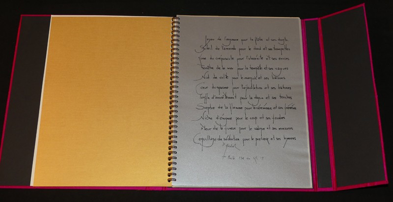 EDITION ORIGINALE. TIRAGE LIMITE A 30 EXEMPLAIRES. In-4 (24 x 30 cm), étui à rabats de soie rose fuschia magnétisé contenant un livre relié par une spirale en fer, imprimé sur divers papier par Rimbaud à Cavaillon. Les sujets féminins des 8 photographies originales reproduites de Lucien Clergue sont "tatouées" des vers calligraphiés de l'auteur grâce à un procédé de calques semi-opaques. L'ouvrage est accompagné d'une chemise de soie noire dans laquelle est contrecollée une photographie originale de "zébrée" de Lucien Clergue sur papier argentique, tirée en noir par Véronique Coty dans l'atelier du photographe. La chemise est signée en blanc sur papier d'Arches noir par l'artiste et l'auteur en regard de la photographie. Tirage limité à 30 exemplaires (ici le n°16) ; très bel exemplaire.