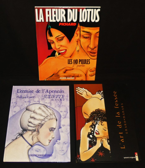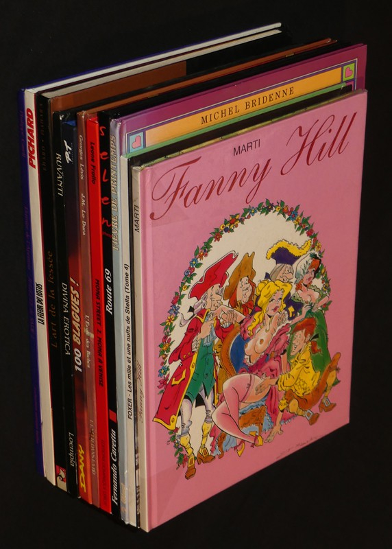 11 albums acartonnés de bandes dessinées érotiques au format in-4, ce lot contient les titres suivants : Fièvre de printemps - route 69 - Mona Street 2 Mona à Venise - l'Ecole des biches - 100 blagues ! très coquines - Fanny Hill - Les mille et une nuits de Stella - Divina Erotica - L'art de la fessée - les 110 pilules 2ème partie - Juliette 2 l'ermite de l'Apennin ; ensemble en bel état.