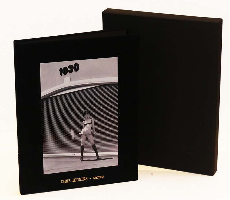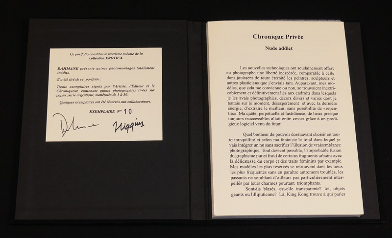 SUPERBE ETAT. In-8 (16 x 20,2 cm), sans date, étui cartonné noir contenant un portfolio en velours noir avec photographie contrecollée au premier plat, 13e volume de la collection EROTICA de Chez Higgins, dans lequel Dahmane présente 15 photomontages tirés sur papier perlé argentique, protégés par des serpentes à motif de toile d'araignée, EXEMPLAIRE N°10/30 SIGNE PAR L'EDITEUR HIGGINS ET L'ARTISTE DAHMANE, qui signe également l'introduction de cet ouvrage ; exemplaire en superbe état.