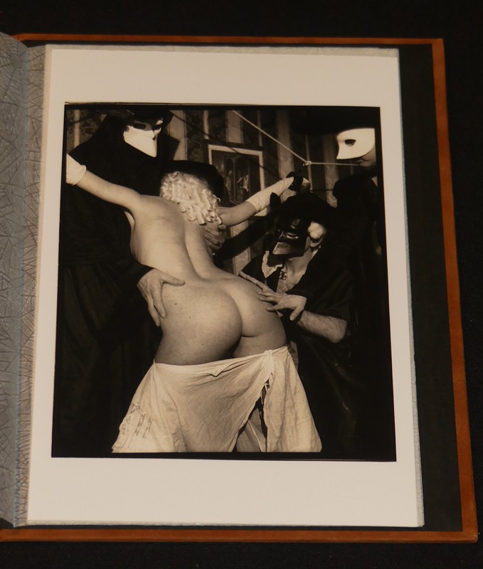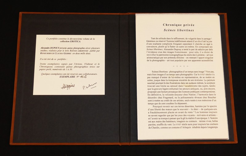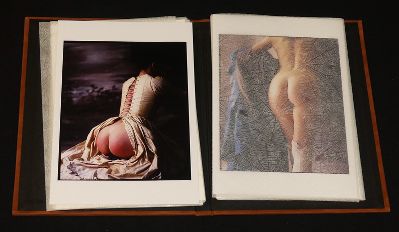SUPERBE ETAT. In-8 (16 x 20,2 cm), sans date, étui cartonné noir contenant un portfolio en velours camel avec photographie contrecollée au premier plat, 19e volume de la collection EROTICA de Chez Higgins, Alexandre Dupouy présente ici quinze photographies dont plusieurs inédites, réalisées pour le livre 'Scènes Libertines' publié par Konkursbuch Claudia Gehrke en 2002, tirées ici sur papier perlé et protégées par des serpentes à motif de toile d'araignée, UN DES QUELQUES EXEMPLAIRES HORS COMMERCE réservés aux collaborateurs imprimés en plus du tirage à 30 exemplaires d'origine, SIGNE PAR L'ARTISTE ET L'EDITEUR, préface de Pierre Gheno ; exemplaire en superbe état.