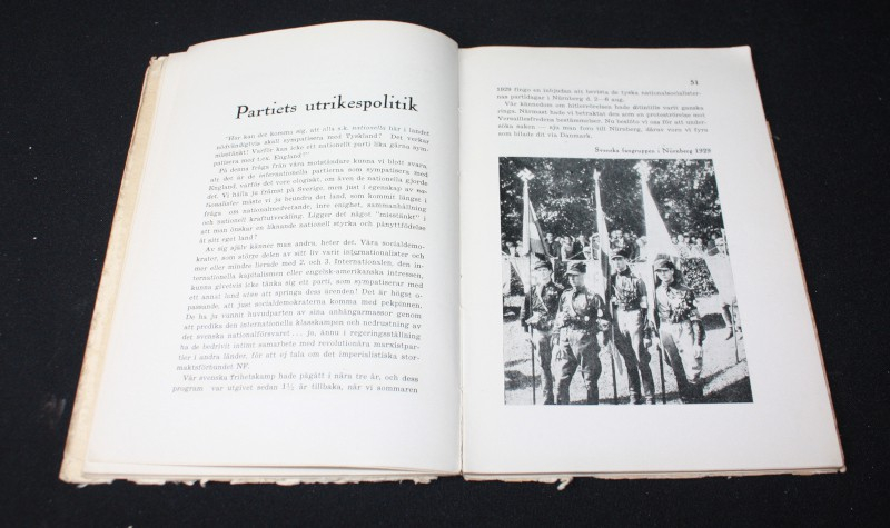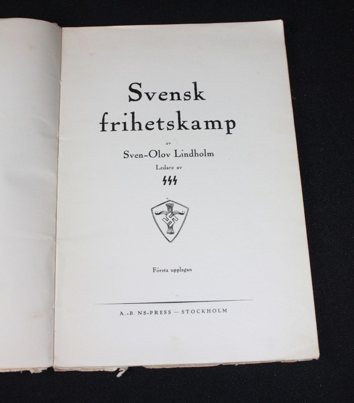 Très rare première édition de ce texte écrit par Sven Olov Lindholm (1903-1998). Broché in-12, sous couverture illustrée, 133 pages, nombreuses photographies noir et blanc dans le texte. Lindholm rejoint en 1927 l'Organisation de lutte fasciste suédoise (SFKO). En 1933, cependant, Lindholm et la jeune génération se séparèrent du SFKO, qui avait ensuite été transformé en Parti national-socialiste suédois, et fondèrent à la place le Parti national-socialiste des travailleurs, qui devint finalement le Parti socialiste suédois (SSS). Document historiquement intéressant qui décrit comment le travail en faveur des idées nationalistes en Suède a été poursuivi avant et pendant la Seconde Guerre mondiale. L'auteur se concentre sur les activités du mouvement et décrit également les contacts avec l'Allemagne et le développement du mouvement suédois ; couverture fatiguée sur les bords, petit manque au quatrième plat, intérieur frais, bon état.