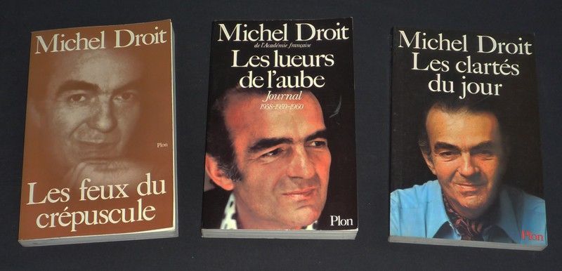 Trois volumes in-8 (15,5 x 24 cm), dos carré collé, journal de Michel Droit dans lequel il remonte le temps, Tome 1 : Les Feux du crépuscules (1977, 255 pp.) ; Tome 2 : Les Lueurs de l'aube (1981, 335 pp.) ; Tome 3 : Les Clartés du jour (1978, 284 pp.) ; quelques petites marques d'usage et défauts de pelliculage au Tome 2, par ailleurs bel état.