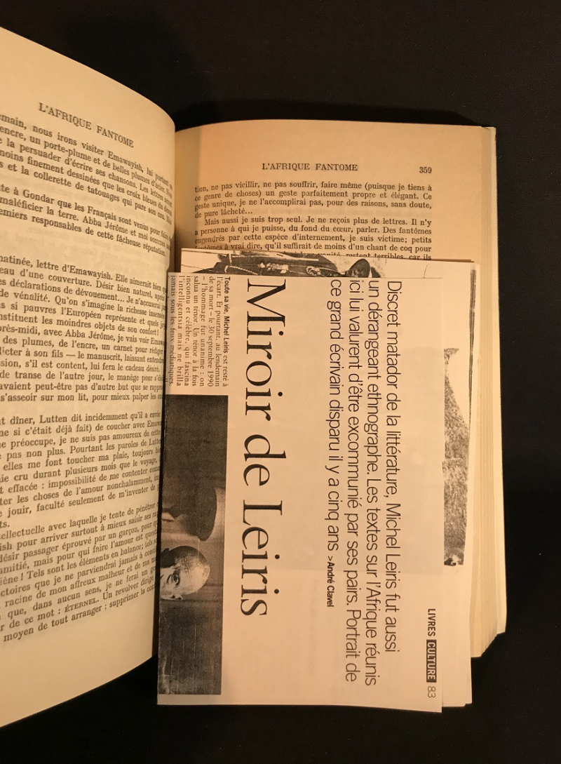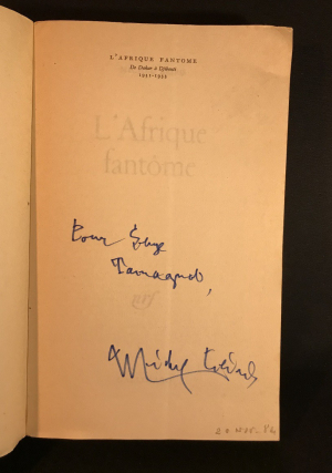 In-8 (14 x 22,5 cm), broché, 533 pages, envoi autographe de l'auteur à Serge Tamagnot signé, truffé par Tamagnot de deux coupures de presse de 1995 et 1996 parlant du rapport de Leiris à l'Afrique ; légères traces d'usures et second plat piqué de quelques rousseurs, bel état par ailleurs.