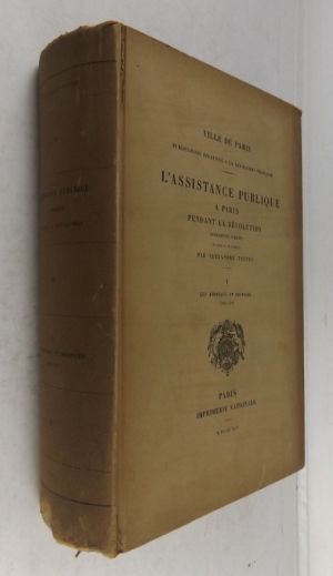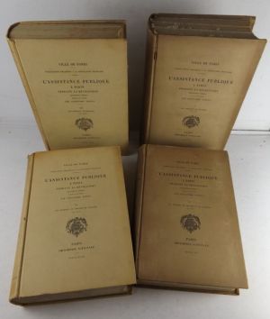 4 volumes in-4 (28.5*18.5 cm.), reliure cartonnée, Tome 1 : Les hôpitaux et hospices (1789-1791), 792 / 729 / 816 / 929 pages non coupées, Tome 2 : Les ateliers de charité et de filature, tome 3: Les hôpitaux et hospices (1791 - an IV), tome 4: Les hospices et ateliers de filature (1791 - an IV), pages non coupées, tableaux explicatifs, correspondance, Publications relatives à la Révolution française ; tomes 1 et 2: couvertures brunies et manques aux coiffes, coins usés, menues déchirures sans manque sur le papier de certain mors, couvertures défraîchies, quelques mouillures aux dos des tomes 3 et 4, tome 4: un choc avec déchirure au bord du 4e plat (sur 2,5 cm) + une déchirure en bas du dos au niveau du mors), intérieur très frais, assez bon état général.