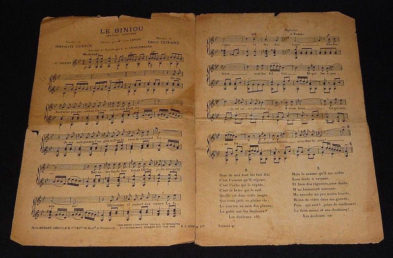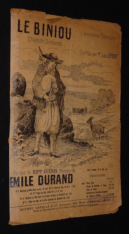 In-4 (17,5 x 27 cm), plaquette en une feuille, 4 pages, chanson bretonne chantée par Jules Lefort, paroles de Hipp. Guérin, musique d'Emile Durand ; pliures et petites déchirures sur les bords des pages, réparation sur la pliure, en l'état.