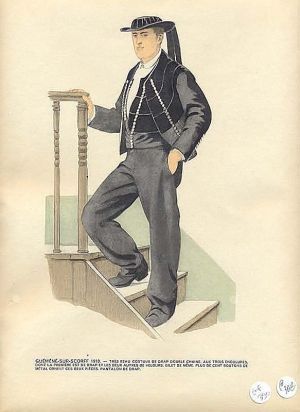 In 4 (23.5x31.5 cm) planche en couleurs rehaussée à la main, tirée de Le Costume Breton de 1900 à nos jours, costume de cachemire largement bordé de velours. Tablier de soie agrémenté de passementerie argent. Coiffe et sous-manches de lingerie brodée ; très bon état.