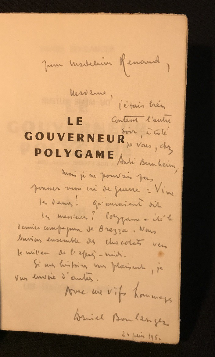 In-12 (12 x 18,5 cm), broché, 206 pages, non coupé, édition originale avec un bel et long envoi autographe pleine-page à Madeleine Renaud, daté et signé, suite à une rencontre chez le collectionneur André Bernheim : « pour Madeleine Renaud, madame, j'étais bien content l'autre soir, à côté de vous, chez André Bernheim, mais je ne pouvais pas pousser mon cri de guerre : Vive les dames ! Qu'auraient dit les messieurs ? Polygame a été le premier compagnon de Brezza. Nous buvions ensemble des chocolats vers le milieu de l'après-midi. Si mes histoires vous plaisent, je vous envoie d'autres. Avec mes vifs hommages Daniel Boulanger 24 juin 1960 » ; légers signes d'usures, bel état par ailleurs.