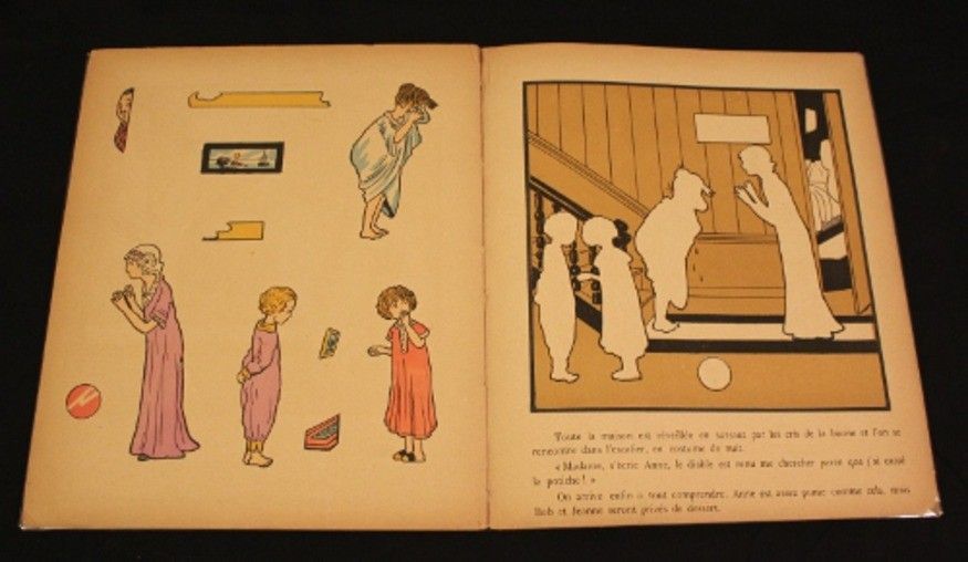 In-8 (21.5x26 cm), broché, couverture illustrée noir et blanc, non paginé (28 pages) ; dos abîmé (manques), il manque une page de personnages et d'objets à découper, rousseurs, pages cornées, état correct pour cet ouvrage rare.