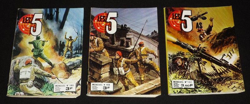 Trois volumes in-12 (13 x 19 cm), dos agrafés, lot de 3 numéros de la série "Les 5 As" : n°189 (Les Déserteurs d'El Alamein), n°190 (L'Echec des 5 As) et n°192 (La Folle aventure du Général Griffith) ; coiffes frottées, quatrième plat du n°189 froissé, par ailleurs bon état.