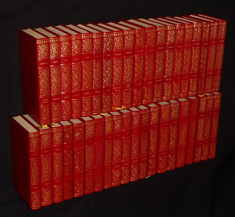 Trente-neuf volumes in-12 (12,7 x 20,5 cm), cartonnés, imprimés en 1967-1970, illustrations en noir hors texte, ensemble quasi-complet comprenant les ouvrages suivants : DOSTOIEVSKI : Les Frères Karamazov - Les Possédés - L'Idiot - Le Joueur - Souvenirs de la maison des morts - Crime et Châtiment // TOLSTOI : La Guerre et la paix - Anna Karénine - Les Cosaques. Nouvelles - Resurrection - Enfance, adolescence, jeunesse // POUCHKINE : Nouvelles // LESKOV : Nouvelles // GORKI : La Mère - Thomas Gordeiev - Mes universités - Enfance - En gagnant mon pain // LERMONTOV : Un héros de notre temps // TOURGUENIEV : Pères et enfants. Nouvelles - Récits d'un chasseurs. Premier amour // GONTCHAROV : Oblomov // TCHEKHOV : Théâtre - Nouvelles // GOGOL : Les âmes mortes - Le Revizor. Nouvelles - Veillées d'Ukraine - Tarass Boulba. Nouvelles ; quelques rousseurs aux tranches, ors passés au dos de "Veillées d'Ukraine", par ailleurs bel ensemble.