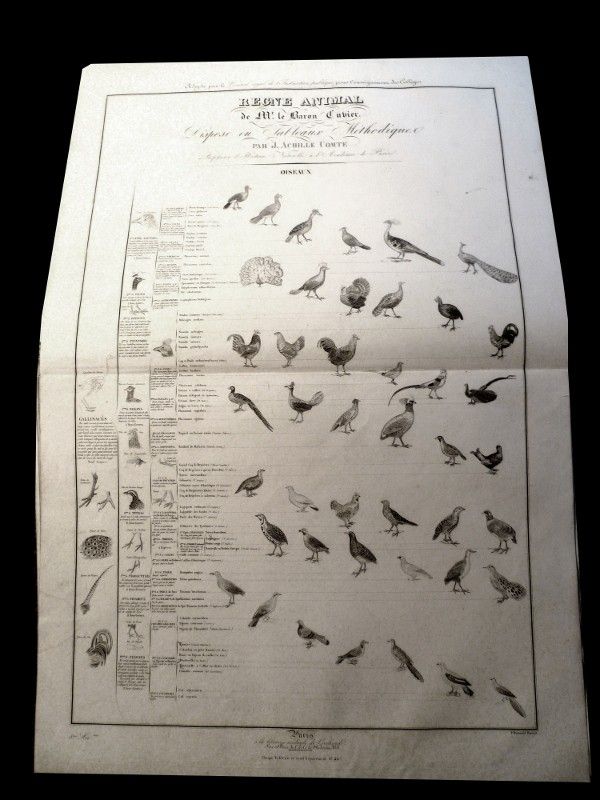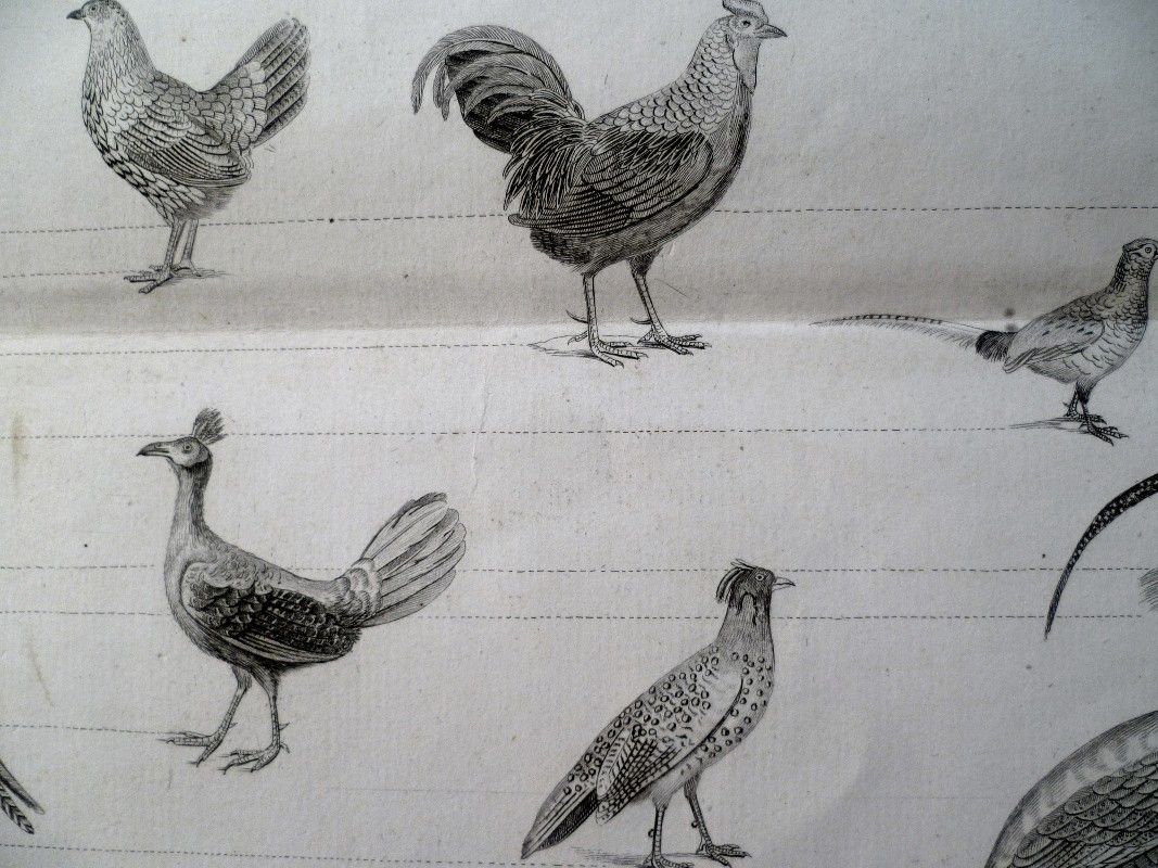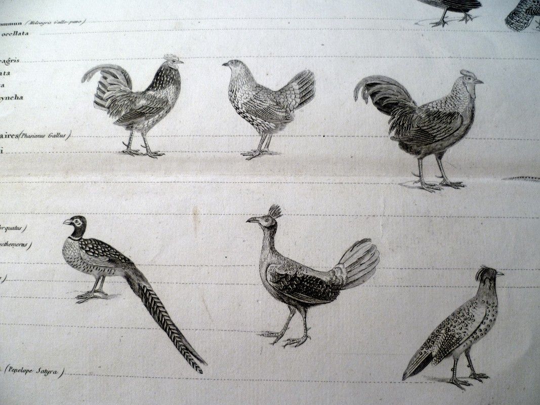 Très belle planche gravée destinée à l'affichage dans les collèges, 55 cm par 81 cm, ici du mitou-poranga à la colombe oxyura en passant par le rouloul de Malacca, planche issue du recueil intitulé : Règne animal de Mr Le Baron Cuvier, disposé en tableaux méthodiques par J. Achille Comte professeur d'histoire naturelle à l'académie de Paris ; Bel état, peu commun.