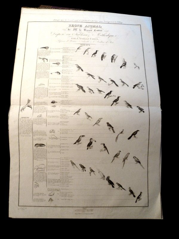 Très belle planche gravée destinée à l'affichage dans les collèges, 55 cm par 81 cm, ici Jacamard d'Amérique au Touraco Violet en passant par le buco parvus, planche issue du recueil intitulé : Règne animal de Mr Le Baron Cuvier, disposé en tableaux méthodiques par J. Achille Comte professeur d'histoire naturelle à l'académie de Paris ; Bel état, peu commun.