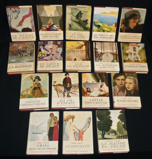 17 volumes in-12 ( 17 x 12 cm.),reliure carton pourpre de l'éditeur sous jaquette illustrée, cette collection a pris naissance en 1938, nos volumes datent des années 40, le nom des illustrateurs des jaquettes n'est pas toujours lisible, ce lot contient les titres suivants : Le désert de l'amour - La leçon d'amour dans un parc - La bataille - Le blé qui lève - Le parfum des îles Borromées - La dame aux camélias - Le noeud de vipères - La maitresse servante - Sur la branche - Un amour de Swann - La maison du péché - Aphrodite - Ramuntcho - Amitié amoureuse - Ma vie d'enfant - Madame Chrysanthème - Ariel ou la vie de Shelley ; menus défauts sur les jaquetes, lot en el état.