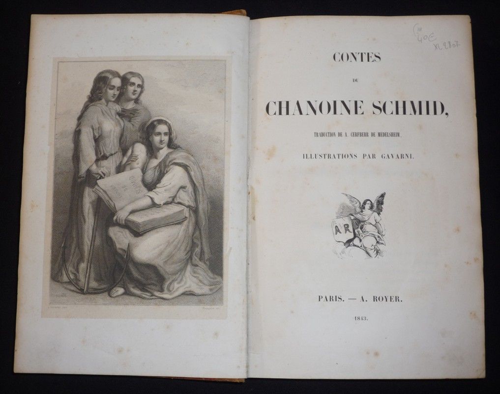 In-4 (18 x 26,3 cm), reliure demi-peau, dos lisse, XVI-404 pages, six contes du Chanoine Schmid : "Godefroi, le petit ermite", "Louis, le petit émigré", "Eustache", "Itha", "Comment Henri d'Eichenfels apprit à connaître Dieu", "Rose de Tannebourg", gravures en noir de Gavarni, deux pages de partition in fine : "Le Matin sur les montagnes", musique d'Adolphe Adam ; marques d'usure sur les plats et le dos, coupes et coins frottés, assez bon état.