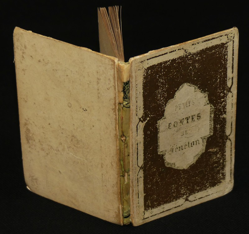 In-18 (5,5 x 8,2 cm), cartonné, 24 pages, premier volume sur trois des Jolis Petits Contes de Fénelon, contenant "Histoire de Florise", "Le Singe" et "Les Deux Souris", deux illustrations hors texte ; dos recollé, plats frottés, par ailleurs assez bon état général.