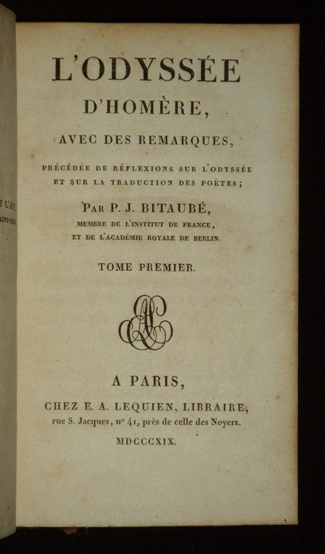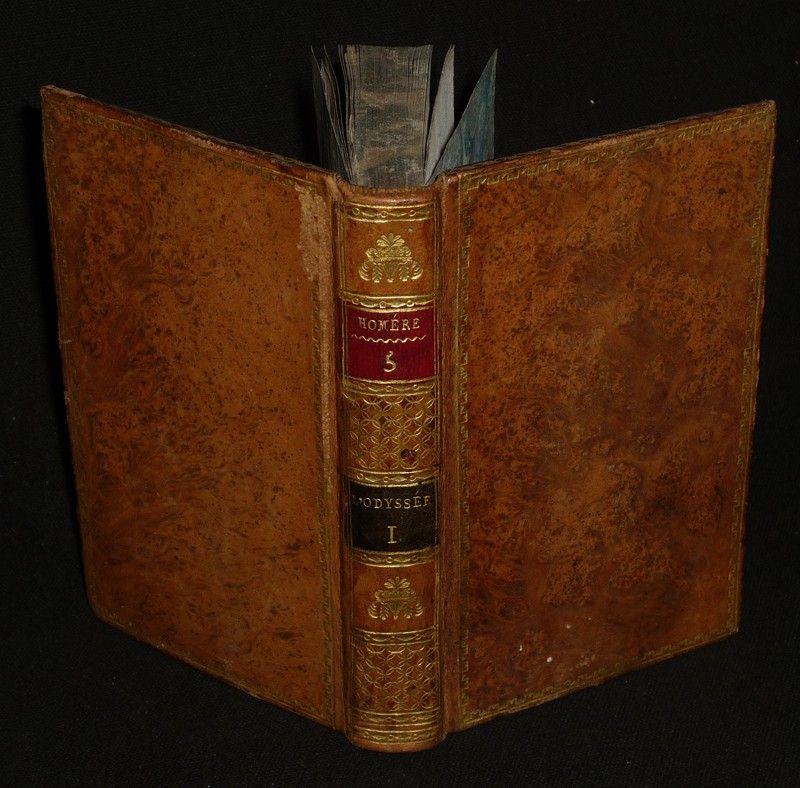 In-12 (9 x 14 cm), reliure plein veau, dos lisse orné de dorures, liseré d'encadrement sur les plats, tranches marbrées, gardes couleur, 262 pages, tome 1 seul de L'Odyssée (et tome 5 des Oeuvres d'Homère) ; petite trace sur le dos, par ailleurs très bon état général.