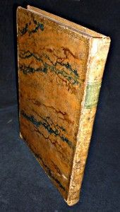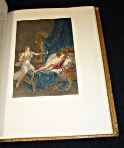 In-4 relié, plein veau blond raciné, petite guirlande dorée en encadrement, dos lisse orné, piece de titre de maroquin vert, tranches dorées (reliure de l'époque), 4 figures hors-texte en couleurs d'après SCHALL, intéressant car un des TOUT PREMIER livres de l'époque présentant des gravures en couleurs pour la première fois non coloriées à la main. De plus notre exemplaire présente en fin d'ouvrage le prospectus annonçant la parution courant 1792 du Paradis Perdu de Milton, 'on ne paie rien d'avance, l'édition sera livrée toute satinée'. Reliure en état correct mais frottée, quelques rousseurs (pas sur les pages gravées).