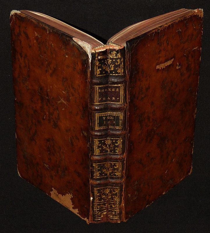 In-12 (13,3 x 20 cm), reliure plein veau, dos à 5 nerfs orné de caissons dorés, tranches rouges, gardes couleur, 491 pages, première traduction des oeuvres de Shakespeare par Le Tourneur, ce tome 9 contient la première et la deuxième partie de Henri IV, roi d'Angleterre ; manques de cuir aux coiffes et coins, épidermure au quatrième plat en queue, par ailleurs intérieur frais, assez bel état général.