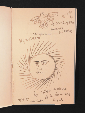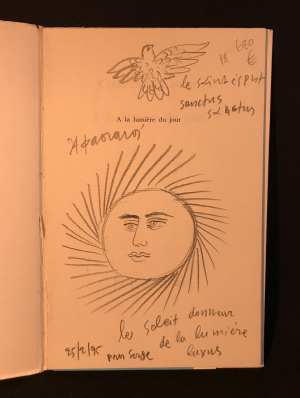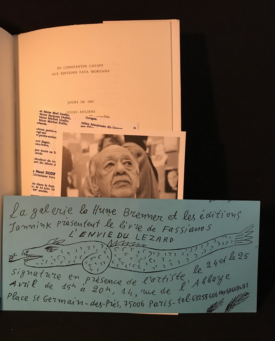 BEAU DESSIN ET ENVOI DEDICACE DE FASSIANOS PLEINE-PAGE ; In-8 (14 x 22 cm), broché, 40 pages, avec 9 illustrations en noir et blanc d'Alecos Fassianos, traduction de Bruno Roy, envoi autographe accompagné d'un dessin iconique (représentant un visage dans un soleil ainsi qu'une colombe avec la mention « le saint-esprit sanctus sanctus ») pleine-page de Fassianos : « 25/2/95 le soleil donneur de la lumière luxus Pour Serge », truffé par Serge Tamagnot d'une invitation pour la sortie du livre « L'envie du lézard » de Fassianos à la galerie la Hune Brenner, le 24 et 25 Avril de 15h à 20h, en présence de l'auteur où l'envoi a été réalisé, ainsi que d'une carte postale représentant Ionesco édité par la même galerie et la coupure de presse d'une rubrique nécrologique où est entourée le décès de Mouloudji le 14 juin 1994; bon état général.
