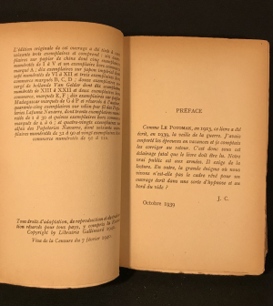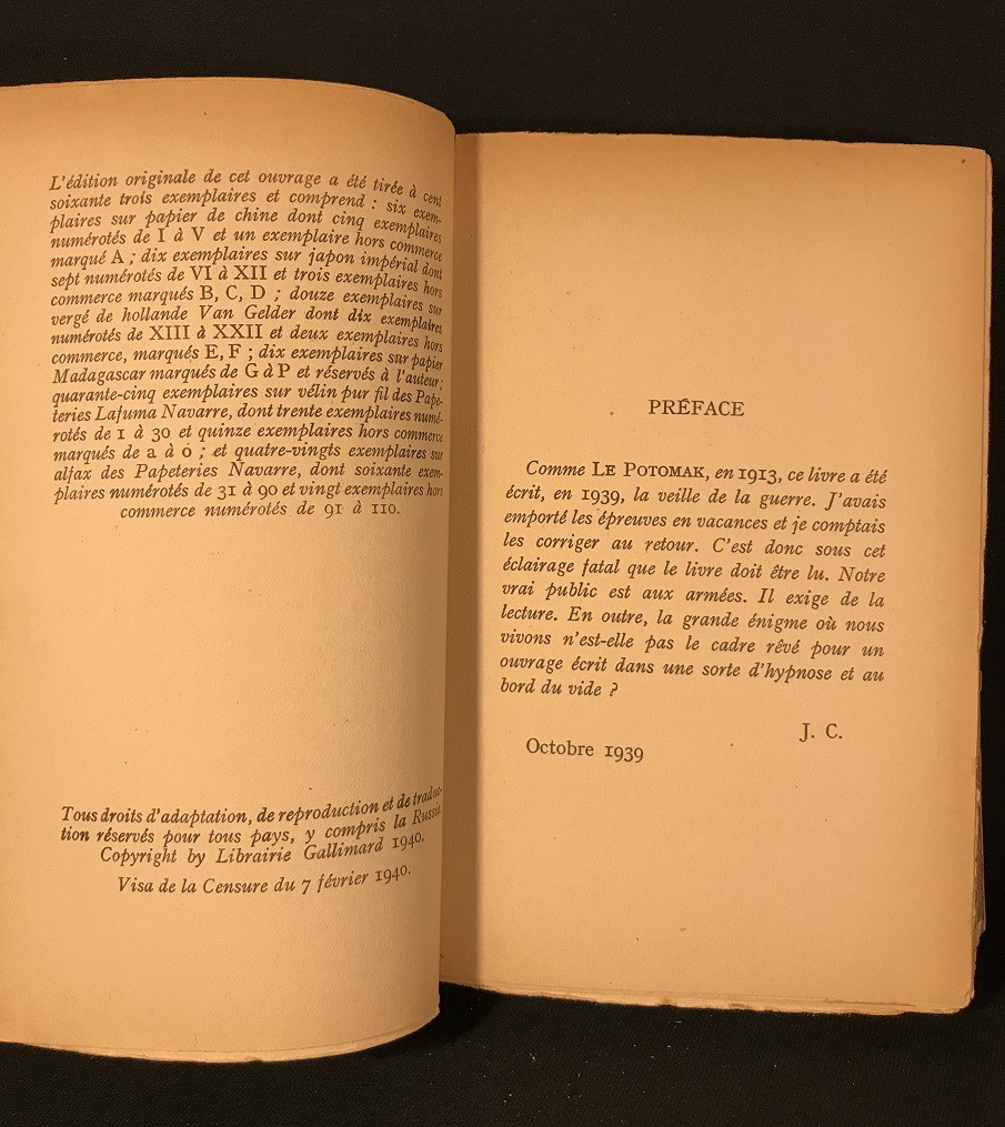 In-12 (12 x 18,5 cm), broché, 196 pages, réelle édition originale, première édition de 1940 avec Visa de la Censure du 7 février 1940 ; plats légèrement insolés ainsi qu'ayant de petites mouillures, déchirures en queue de coiffe, bon état par ailleurs.