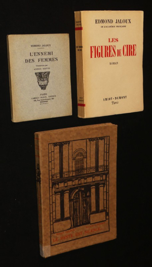Trois volumes brochés, L'ennemi des femmes, chez Camille Bloch, 1921, ornements par Hofer - Les Figures de cire, chez Amiot-Dumont, 1947 - Le reste est silence, Éditions Lapina, 1925, bois de...