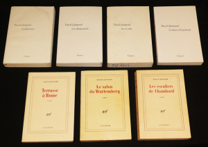 Sept volumes in-8 brochés ( 21 x 14 cm.), ce lot comprend chez Gallimard : Le salon de Wurtemberg - Les escaliers de Chambord - Terrasse à Rome, Chez Grasset : L'enfant d'Ingolstadt - Sur le jadis - Les désarçonnés - Sordidissimes ; Une mouillure sur une des couvertures, une couverture piquée, tranches quelquefois piquées et sur deux d'entre elles des tampons et écritures, lot malgré tout en bon état.