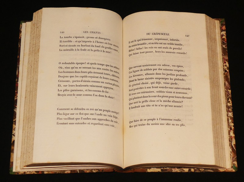 In-8 (13,5 x 22 cm), reliure demi-veau d'époque, dos à 5 nerfs orné de dorures et de fers estampés à froid, XVIII-334 pages (la page 334 est notée 354 par erreur), édition originale, bien complet de la dernière page de nomenclature des oeuvres de Victor Hugo ; frottements aux coupes, quelques rousseurs à l'intérieur par ailleurs frais, bel exemplaire.