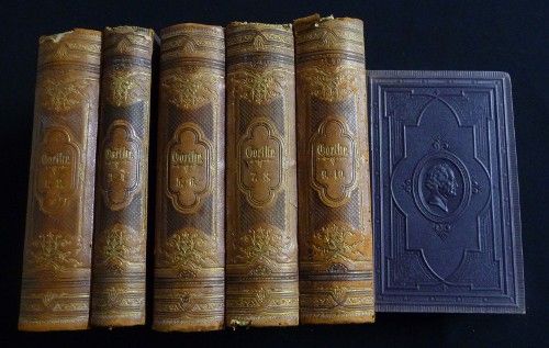 In-8 (20 x 14 cm), demi-reliure peau, plats de percaline estampés à froid, 315, 268, 356, 274, 494 et 331 pages, 12 volumes en 6 tomes contenant les oeuvres de Goethe, texte en allemand, typographie gothique ; coiffe supérieure des tomes 1-2, 3-4, 7-8 et 9-10 légèrement déchirée, quelques coins usés, intérieur frais, assez bon état général.