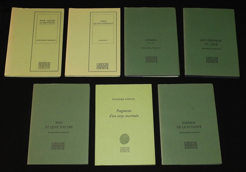 Lot de 7 ouvrages tous édités chez Manier-Mellinette éditeur, imprimerie de Cheyne et tous brochés sous couverture rempliée, 5 des exemplaires comportent un envoi de l'auteur, ce lot contient : Pour saluer la Bienvenue, 1987 - Celle qu'on attendait,1990 - Poèmes 1983-1985, 1996 - Aux enfances du jour, 1998 - Passage de la fuyante, 1994 - Fragments d'un corps incertain, 2009 - Bleu et quoi d'autre, 2001 ; très beaux exemplaires.