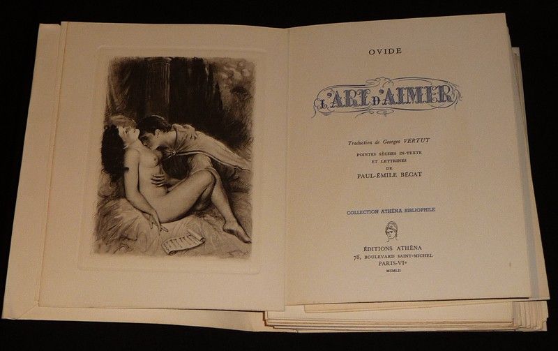 In-8 (18 x 23 cm), exemplaire en feuilles sous couverture rempliée et emboîtage cartonné en velours, 181 pages, 1 de 770 exemplaires sur Chiffon des Papeteries d'Arches (n°582), pointes sèches in-texte et lettrines de Paul-Emile Bécat ; angles de l'étui un peu frottés, par ailleurs bel état.