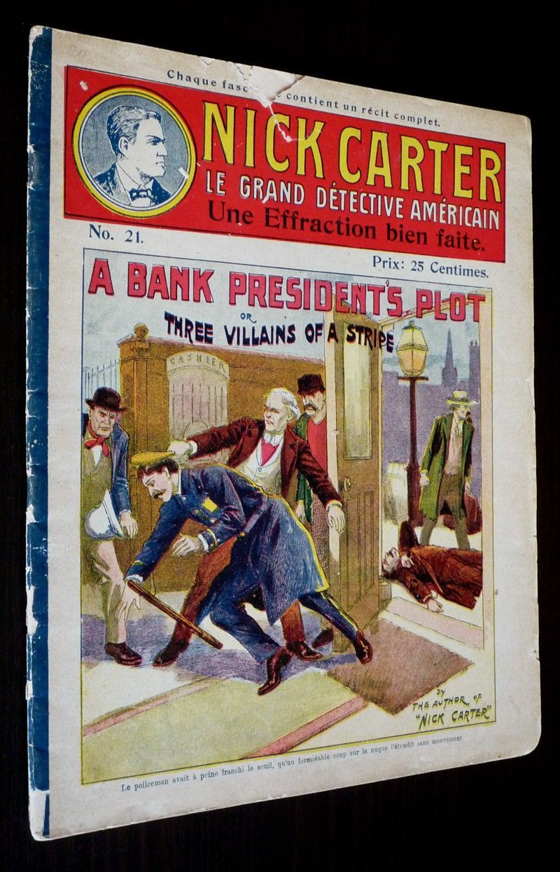 In-4 (21,8 x 27,5 cm), fascicule agrafé, 32 pages, sans date, n°21 de la 1ère série de "Nick Carter", couverture au médaillon ; quelques petites déchirures sur le dos et le bord des plats, par ailleurs bon état général.