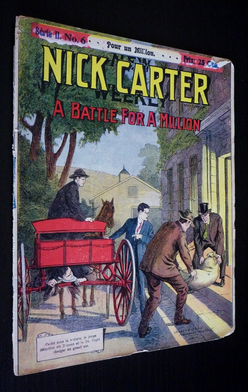 In-4 (21,5 x 27,5 cm), fascicule agrafé, 32 pages, sans date, n°6 de la 2e série de "Nick Carter", couverture illustrée pleine page ; dos fendu (plats détachés), bords des plats légèrement usés, par ailleurs assez bon état général pour ce type de publication relativement fragile.