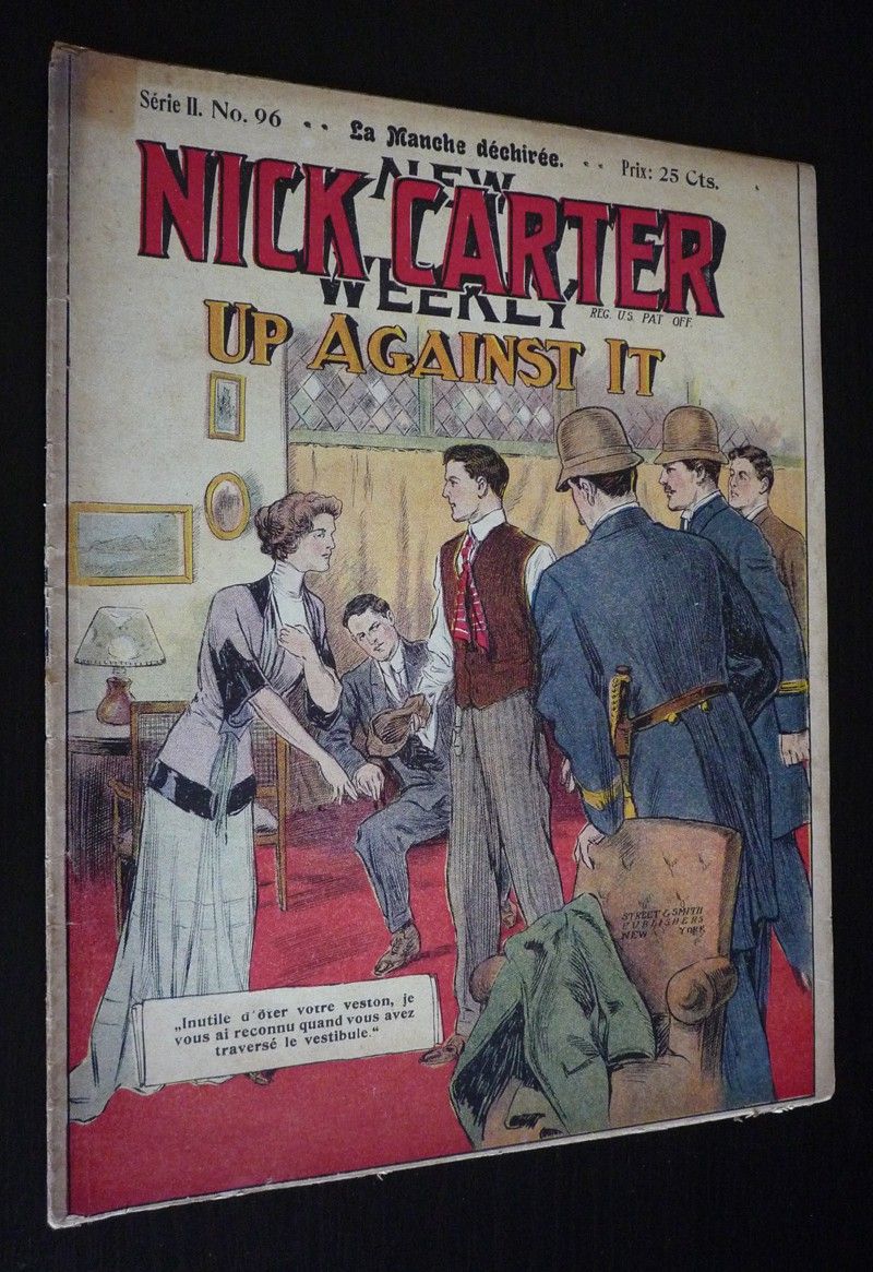 In-4 (21,8 x 27,5 cm), fascicule agrafé, 32 pages, sans date, n°96 de la 2e série de "Nick Carter", couverture illustrée pleine page ; dos légèrement usé, ensemble bruni, par ailleurs bon état général pour ce type de publication relativement fragile.