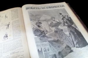Deux volumes in-4 (29.5x39.5 cm), reliés demi-chagrin rouge, titre doré aux dos lisses, du n°1 (6 janvier 1895) au n°52 (décembre 1895), 8e année, les récits contenus dans les pages 11 à 14 de chaque numéro ont été reliés en fin de volume pour en faciliter la lecture, illustrations couleurs et noir et blanc in et hors-texte ; coiffes, coins et bords un peu frottés, quelques rayures et traces de frottement sur les plats, quelques rousseurs à l'intérieur, assez bon état.