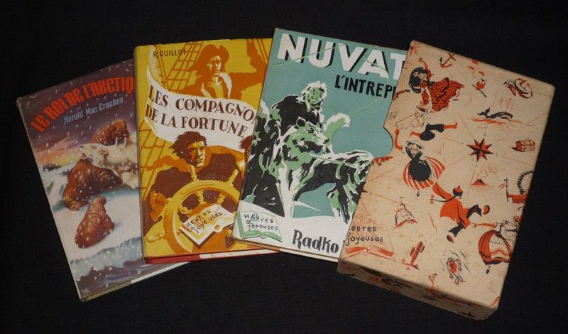 Trois volumes in-12 (12 x 18 cm), cartonnés avec jaquette dans un rare emboîtage "Arctique" de l'éditeur : "Nuvat l'intrépide" par Radko Doone (1948, 218 pp.) - "Les Compagnons de la fortune" par René Guillot (1950, 239 pp.) - "Le Roi de l'Arctique" par Harold MacCracken (1948, 196 pp.) ; quelques petites traces sur les dos et quatrièmes plats des jaquettes, brunissures aux gardes du second volume, deux angles de l'emboîtage fendus, bel état général.