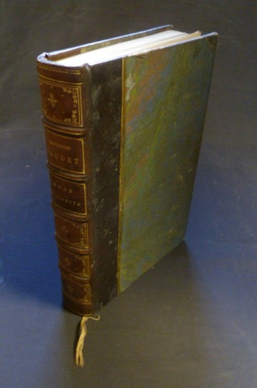 In-12 (12 x 19 cm), demi cuir rehaussé d'un filet doré, dos à cinq nerfs ornés de dorures aux fers, 348 pages, frontispice de Marold, gardes couleur, tranche de tête dorée ; coins et bords frottés, dos insolé, bon état général.
