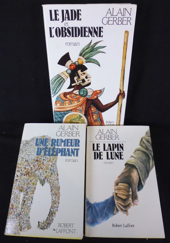 Lot de 3 romans in-8 (15,5 x 24 cm. max.), dos carrés collés sous jaquette illustrées, "Le lapin de lune" (291 pages - 1982), "Une rumeur d'éléphant" (462 pages - 1984), "Lee jade et l'obsidienne" (387 - 1981) ; coiffes de la jaquette un peu frottés, par ailleurs très bon état d'ensemble.