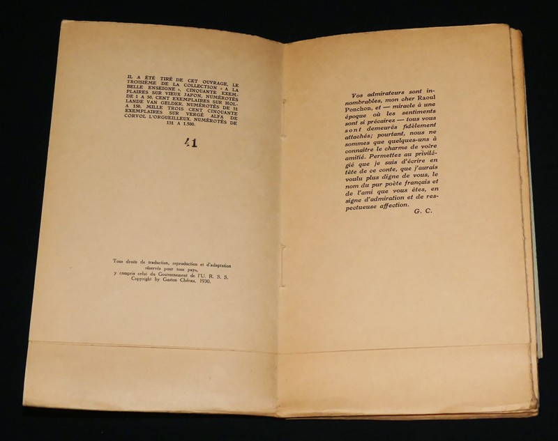 In-8 (14,2 x 24 cm), broché, couverture rempliée, 113 pages, 1 des 50 exemplaires sur vieux Japon (ici le n°41), exemplaire à toutes marges, couverture illustrée par André Hellé ; pâles rousseurs aux plats, par ailleurs bel exemplaire.