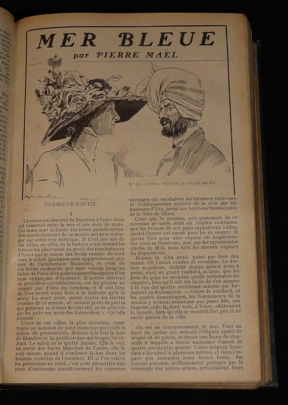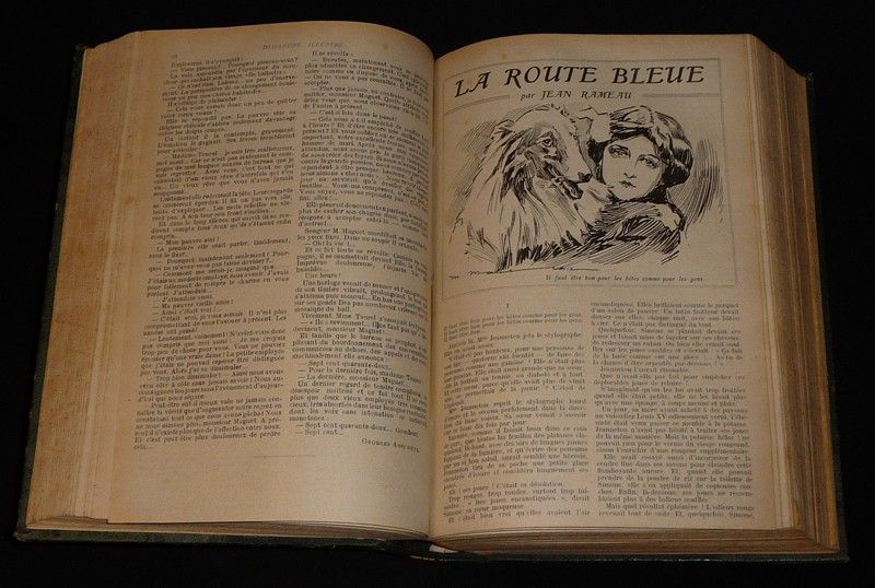 In-8 (17,5 x 24,5 cm), reliure demi-peau, dos lisse, recueil de romans publiés dans Dimanche illustré : 1. "Le Complot" par Philipps Oppenheim // 2. "La Veuve" par Octave Feuillet // 3. "Mer bleue" par Pierre Maël // 4. "La Dernière Parade des Grenadiers Blancs" par Henry d'Estre // 5. "Et l'amour dispose" par Mathilde Alanic // 6. "Scène de la vie diplomatique. La clé d'or" par le Comte Charles de Moüy // 7. "Les Etiolés" par Georges Anschutz // 8. "La Route bleue" par Jean Rameau // 9. "Une tache d'encre" par René Bazin // 10. "Le Petit Jésus Noir" par Philippe Maquet // 11. "Le Frisson sacré" par Jean Bertheroy // 12. Monsieur des Lourdines" par Alphonse de Châteaubriand // 13. "L'Elève Gilles" par André Lafon // 14. "Le Coffret de laque" par Jean Vézère // 15. "Deo Gratias" par Léon de Tinseau // 16. "La Terre qui meurt" par René Bazin // 17. "Les Ames fiancées" par Fernand Dacre // 18. "Les frontières du coeur" par Victor Marguerite // 19. "Les Deux Châtelaines" par Charles Géniaux // 20. "Le Fiancé de Josette" par Paul Junka // 21. "La Poudrière" par Henry Peyre de Bétouzet // 22. "Petite Mienne" par Jean Rameau // 23. "Un pardon" par Paul Renaudin // 24. "Le Voeu de Béatrice" par Madame Octave Feuillet // 25. "Le Curé de Lanslevillard" par Henry Bordeaux // 26. "Reconquise" par Resclauze de Bermon // 27. "Ce bon M. de Vérague" par Maurice Maindron // 28. "Les Ruines en fleurs" par Guy Chantepleure // 29. "Le Finale de la symphonie" par Léon de Tinseau // 30. "Episode du siège de Paris : Le paté d'éléphant" par Frantz Jourdain ; dos insolé, mouillure au premier plat, marques d'usure sur les plats, quelques rousseurs à l'intérieur, état moyen.