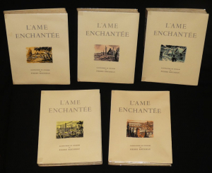 Cinq volumes in-8 (16,5 x 21,3 cm), brochés, couvertures rempliées, 1 de 1500 exemplaires sur vélin des papeteries du Marais, 268, 287, 274, 276 et 250 pages, jolies illustrations en couleurs hors texte de Pierre Rousseau ; rousseurs aux tranches, pliures au dos du tome 1, quelques rares petites rousseurs sur les plats et dos du tome 1, par ailleurs très bel exemplaire.