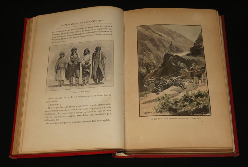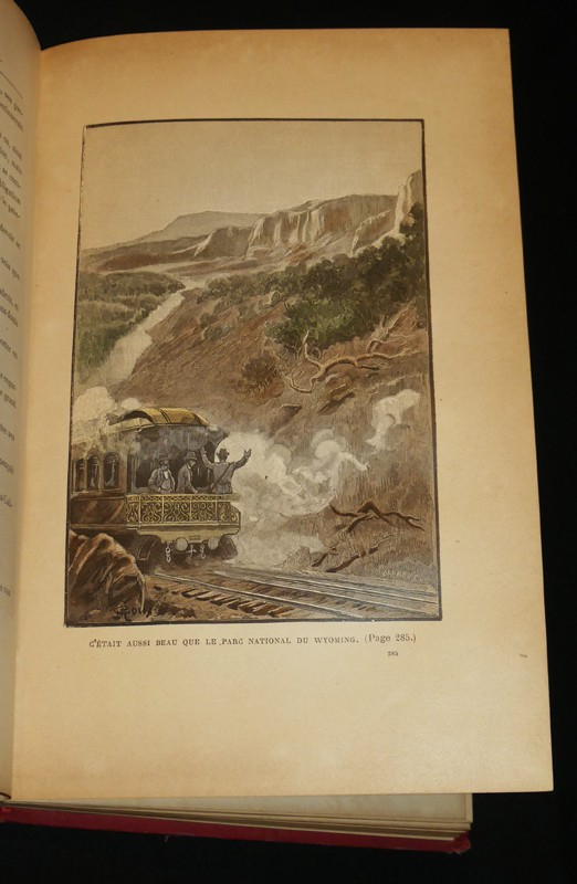 In-4 (19 x 28,2 cm), cartonnage de l'éditeur au globe doré dit à la mappemonde, tranches dorées, 479 pages, édition originale, catalogue 1899-1900in fine, 61 illustrations en noir de George Roux, 35 vues des Etats-Unis, bien complet de la carte dépliante, sans le jeu de l'oie ; dos insolé, coiffes, mors et quatrième plat frottés, résidus de colle ou de verni au premier plat, par ailleurs assez bon état général.
