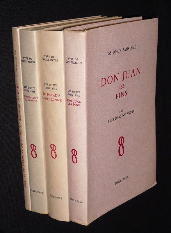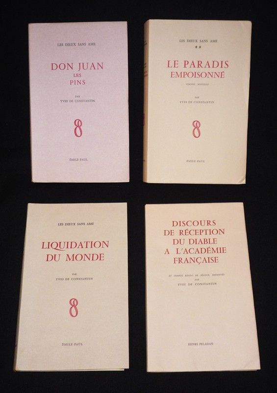 Quatre volumes in-8 (14,5 x 23 cm), brochés, couvertures rempliées, série "Les Dieux sans âme" complète, exemplaires numérotés : 1. "Don Juan les Pins" (Emile-Paul, 1973, 209 pp., ex. n°285 sur vélin pur fil Lafuma) // 2. "Le Paradis empoisonné" (version nouvelle) (Emile-Paul, 1980, 325 pp., ex. n°165 sur Japon mat) // 3. "Liquidation du monde" (Emile-Paul, 1977, 188 pp., ex. n°200 sur Japon mat) // 4. "Discours de réception du Diable à l'Académie française et compte-rendu de séance" (Henri Peladan, 1981, 70 pp., ex. n°394 sur vélin Corot de Navarre ; très bon état général.