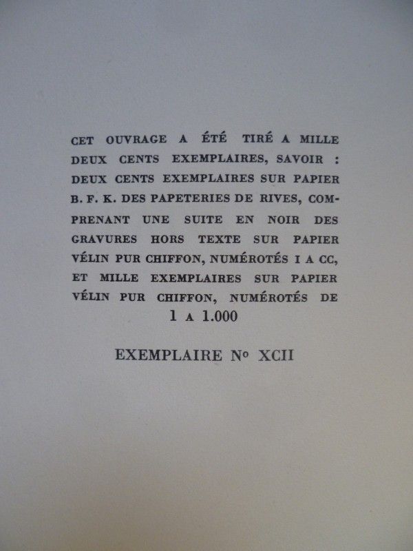 Grand in-8 (19 x 25 cm), broché, 160 pages, un des deux cents exemplaires sur Rives, couverture rempliée, traits au noir, lot de gravures tirées en phototypie et coloriées à la main ; déchirure de 1.5 cm en tête du mors postérieur, coiffes un peu frottées , bel état par ailleurs.